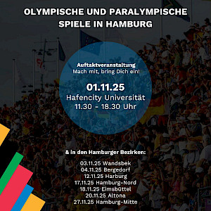 Deine Stadt, Deine Stimme, Deine Spiele! Die Stadt Hamburg lädt ein zum Olympia Dialog am 01.11.2025 von 11:30 bis 18:30 Uhr in der Hafen City University. Komm vorbei!