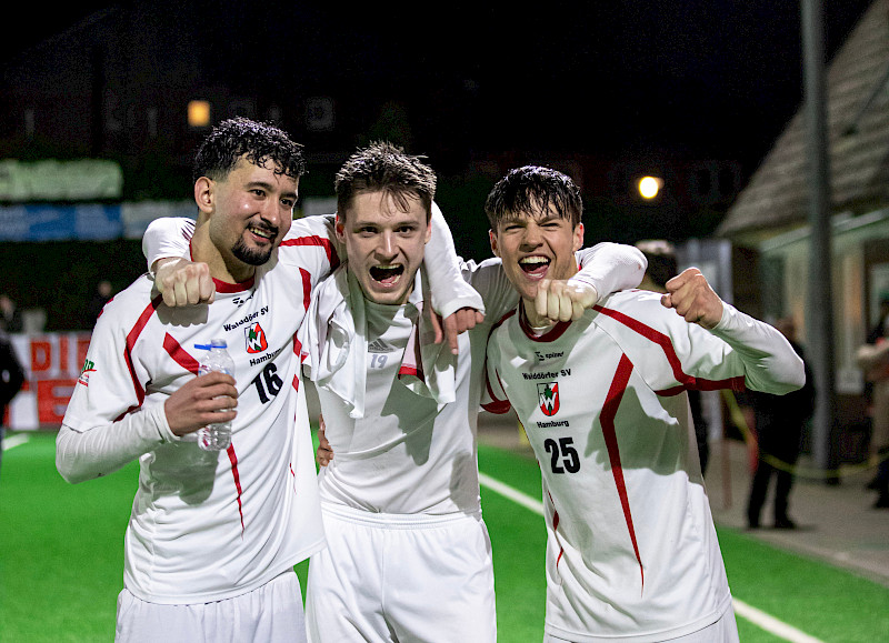 Das Ziel: Der Pott nach Volksdorf Nach dem Abpfiff hielt es niemanden mehr auf den Plätzen. Die „Waldis“ und ihre Fans stürmten den Platz und feierten den Finaleinzug. „Wir sind stolz auf die Jungs, sie haben sich heute selbst beschenkt. Der Kampfgeist jedes Einzelnen war unglaublich“, so das Trainerteam nach dem Spiel.