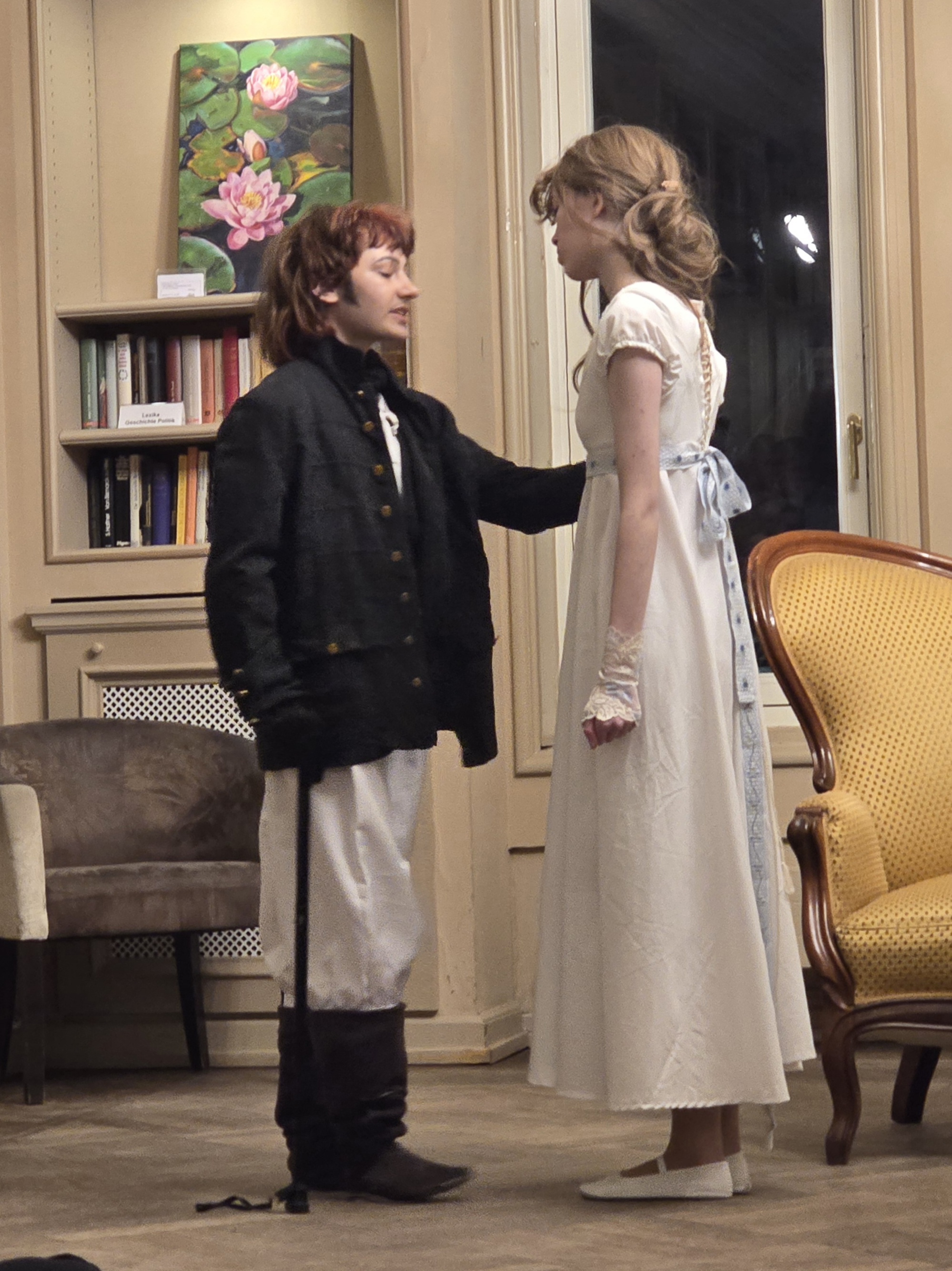 In vier atmosphärischen Szenen öffnete das Ensemble Türen zu ganz unterschiedlichen Gefühlswelten: die vibrierende Familienenergie der Familie Bennet in Longbourn, das funkelnde Wortgefecht zwischen Elizabeth und Darcy in Netherfield, die bedrückende Klarheit von Lydias London‑Episode, die stummen Machtspiele in Rosings. Jede Szene zeigte einen anderen Klang – und alle zusammen zeichneten ein Bild davon, wie fein diese Gruppe von jugendlichen Schauspielern arbeitet.