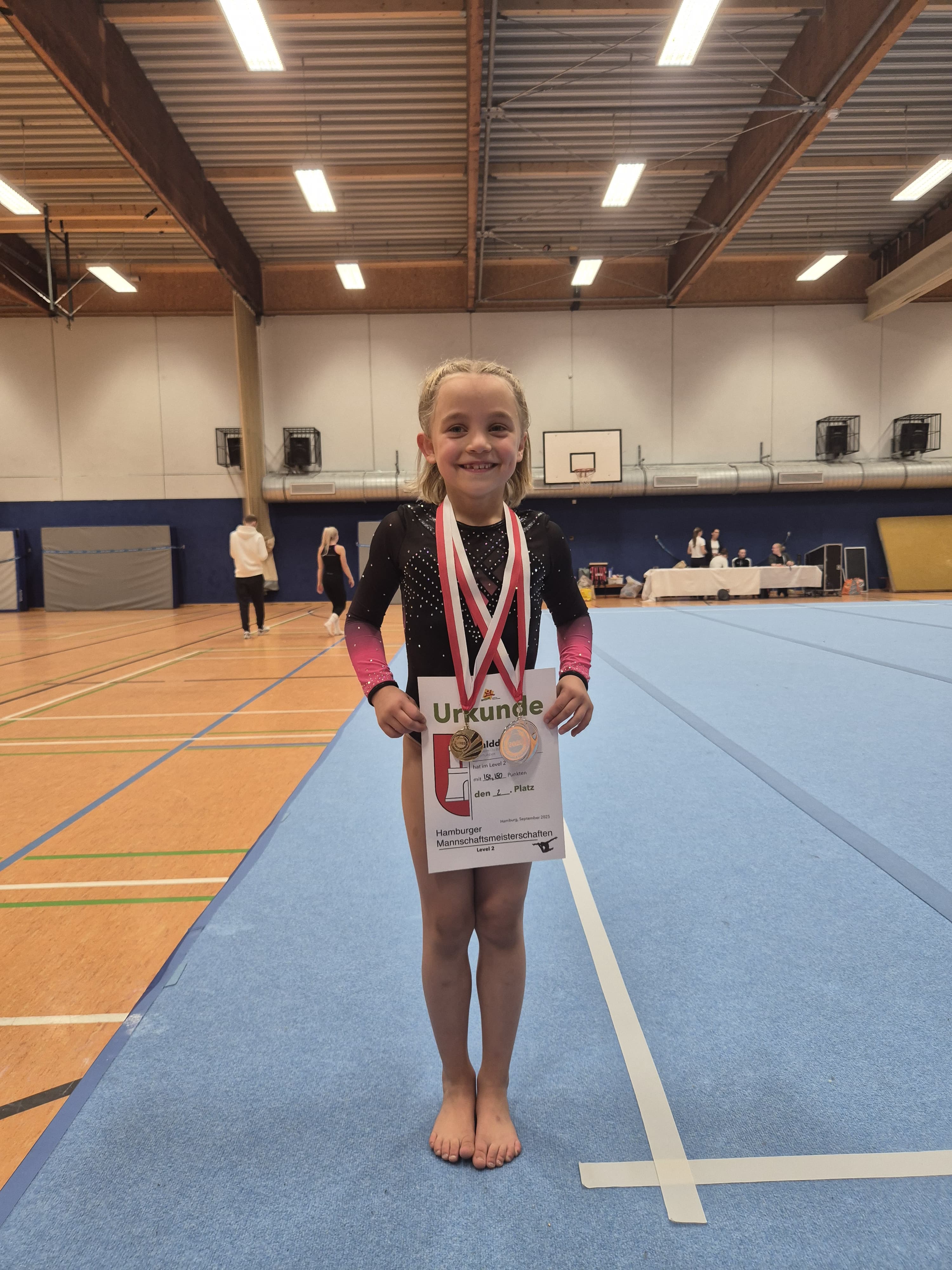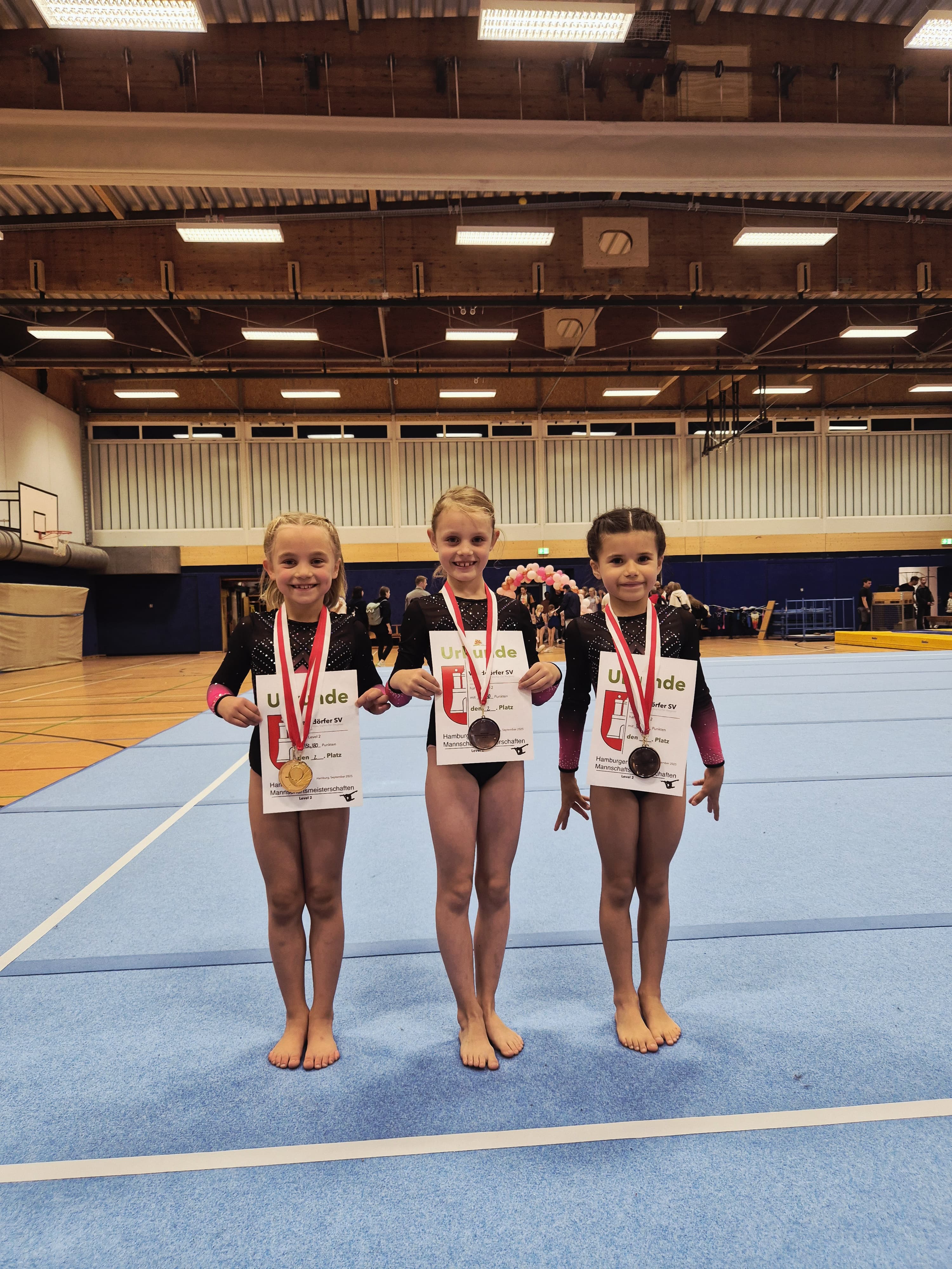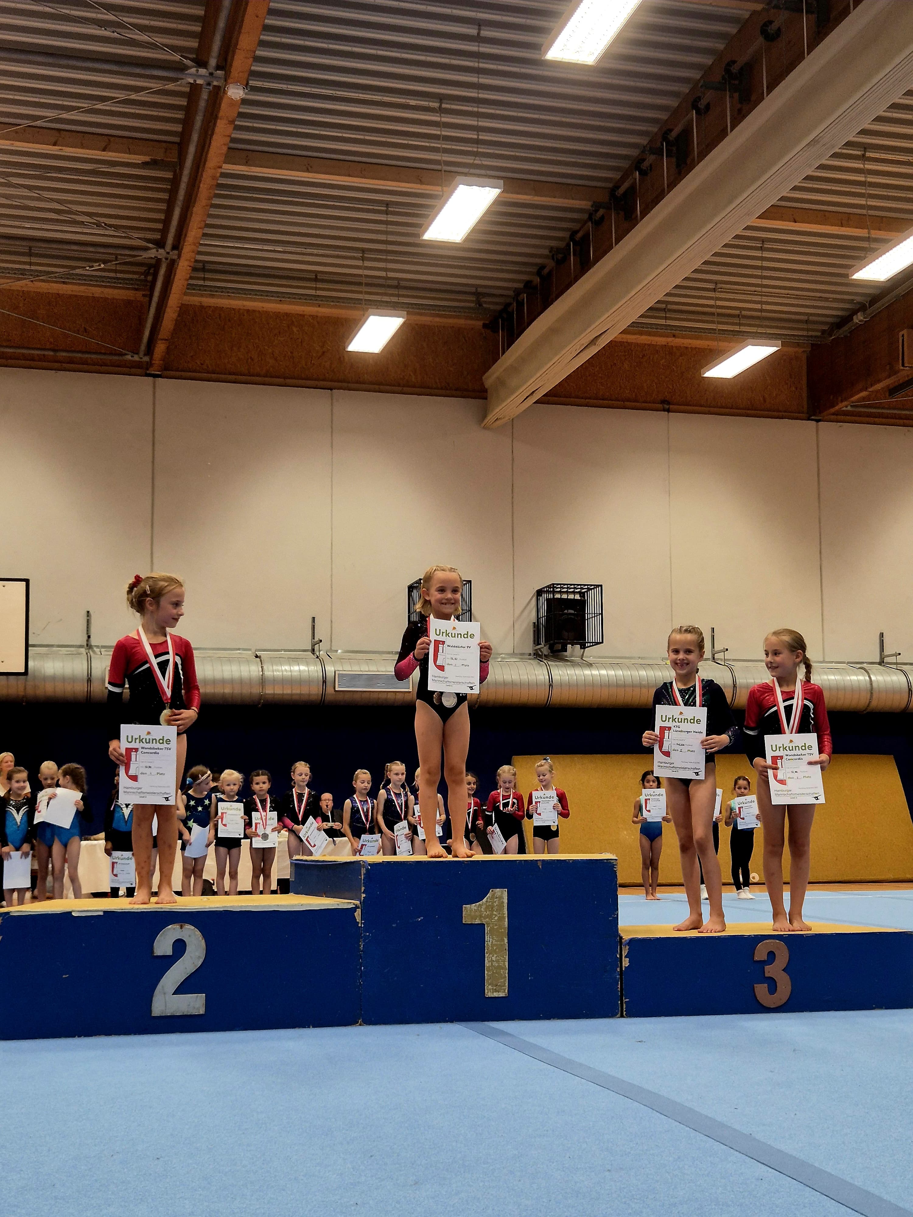 Aufgrund der Verletzung einer Turnerin haben wir auch in derAK 7 eine Gruppe mit einem anderen Team (VfL Geesthacht) gebildet.Gemeinsam konnten wir in dieser Gruppe Hamburger Vizemeister Titel erkämpfen. In der Einzelwertung Sprung konnte Lilly aus unserem Team sogar Gold holen.