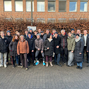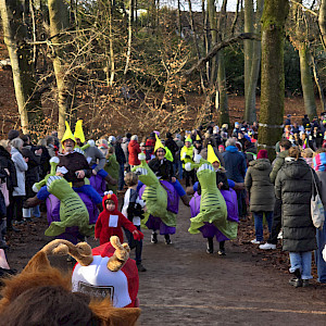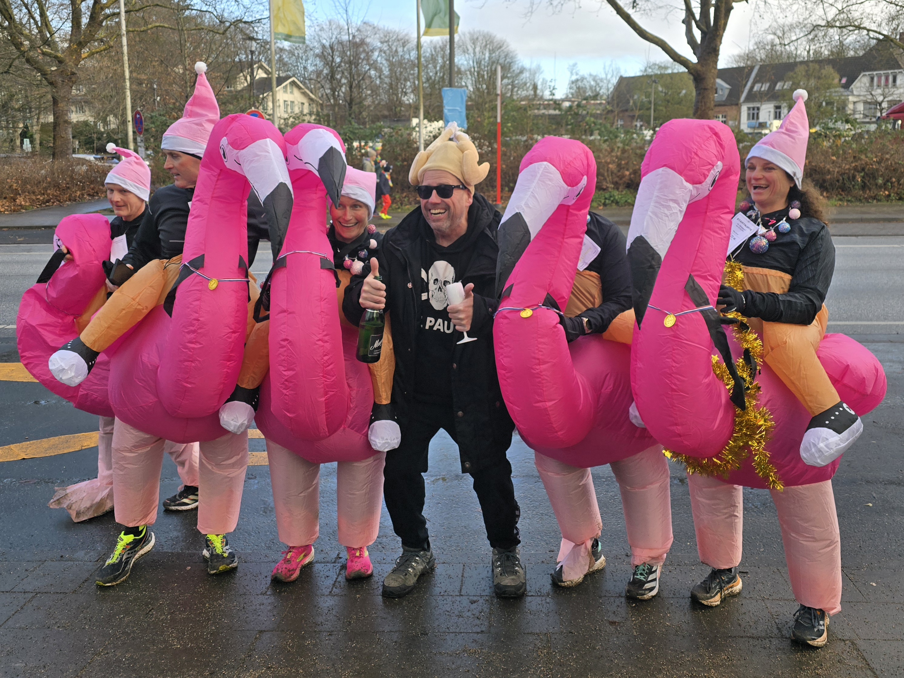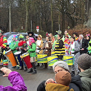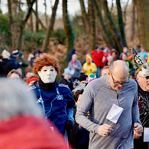 Schon ab 11:30 Uhr sammelten sich am 31.12.2025 die kostümierten Läufer vor dem Walddörfer Sportforum und wurden dort von der Samba-Band in Stimmung gebracht.