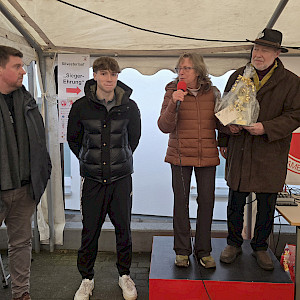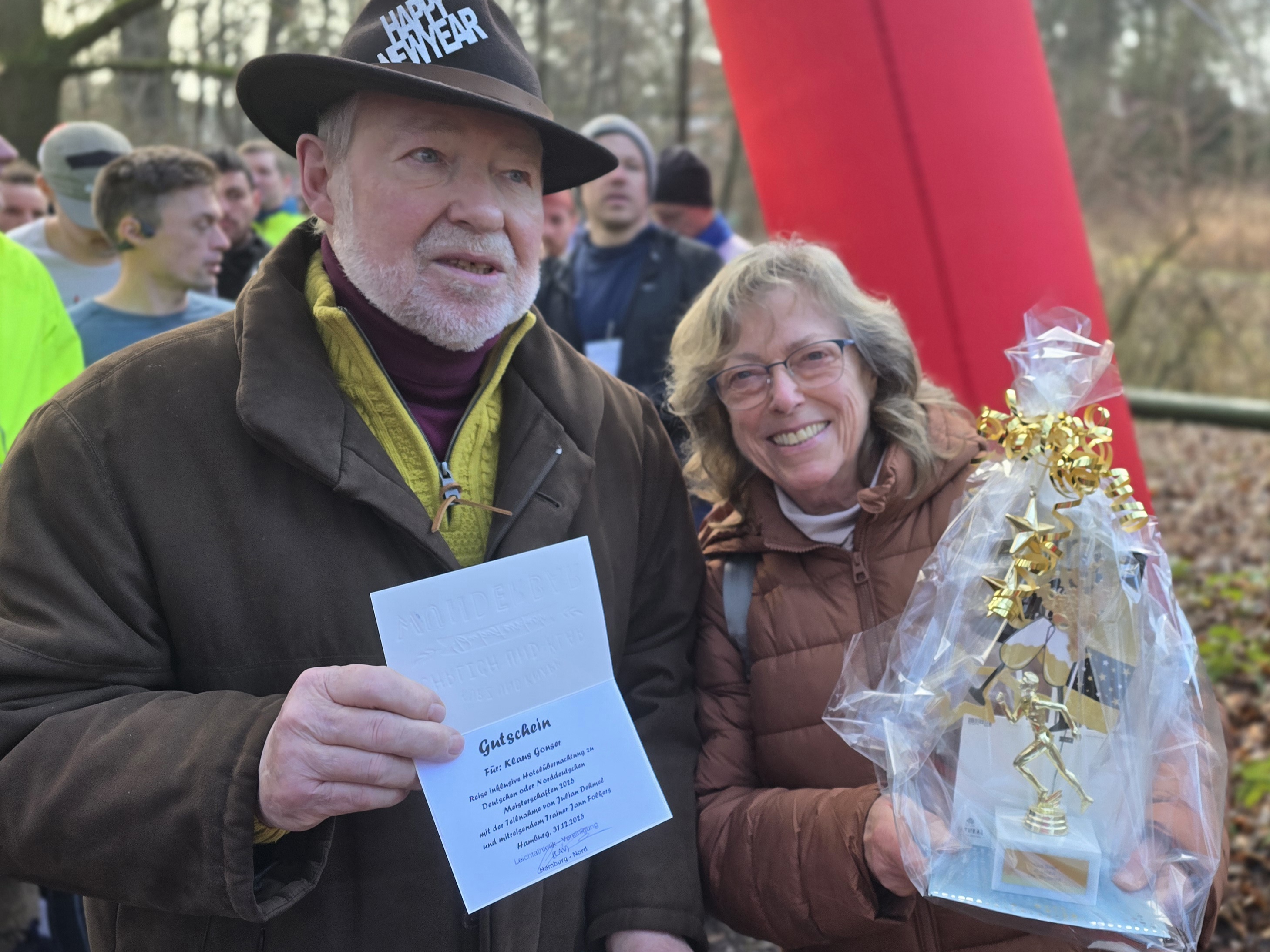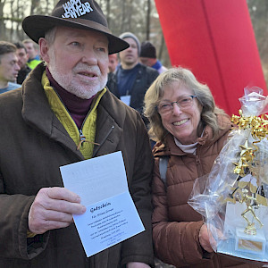 Bevor um 12 Uhr der Startschuß fiel, wurde vor dem großen Torbogen Klaus Gonser, "Miterfinder" des "Silvesterlaufs - Rund um die Teichwiesen" für seinen 40-jährigen Einsatz von Claudia Folckers, Vorsitzende der LAV Hamburg Nord, bedankt und verabschiedet.