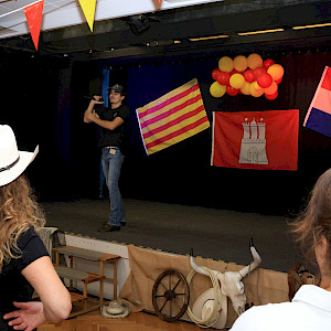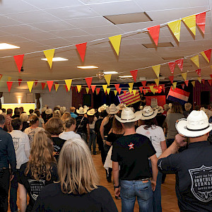 Am Sonnabend 4.10. war es dann soweit, Einlass 13:00Uhr mit Jelly-Shots, Musik ab 14:00. Das hat dann bis 0:30Uhr auch nur noch wenige Momente nachgelassen. Die Unterbrechungsanlässe waren: Begrüßungsredchen von Simone, Geburtstagsständchen, das Kuchenbüffet mit dem von Fleißmeisen selbstgebackenen Kuchen, Workshops mit Pol Francis Ryan (Louisiana, Scorpio), eine begeisternden Aufführung unserer jungen Ladies eines von Emi und Sonja choreografiertem Tanz (Ask Siri by Traveling Cowgilrs) und das Klasse-Caterer Buffet. Es gab viel nettes bis begeistertes Feedback, über das man sich nach der vielen Arbeit freuen konnte.